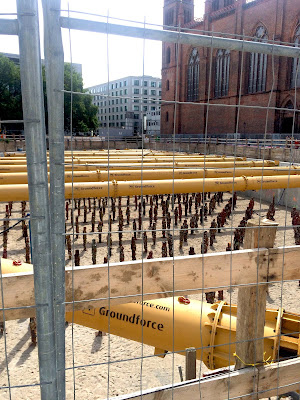 | Die „Trash People“ Armee in der Baugrube neben der letzten noch ganz erhaltenen Schinkel-Kirche in Berlin-Mitte |