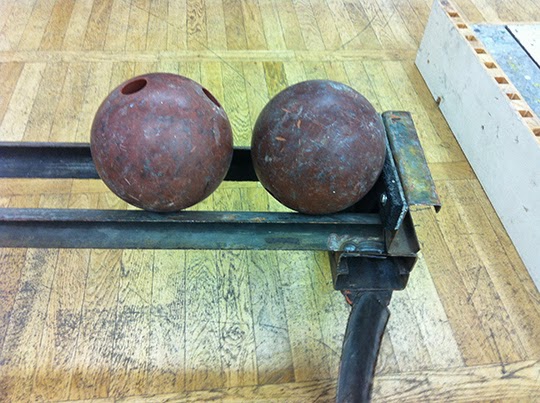 | Michael Sailstorfer „Mit dem Kopf durch die Wand“, 2002 Abbruchmaterial, Kegel, Kegelkugeln |