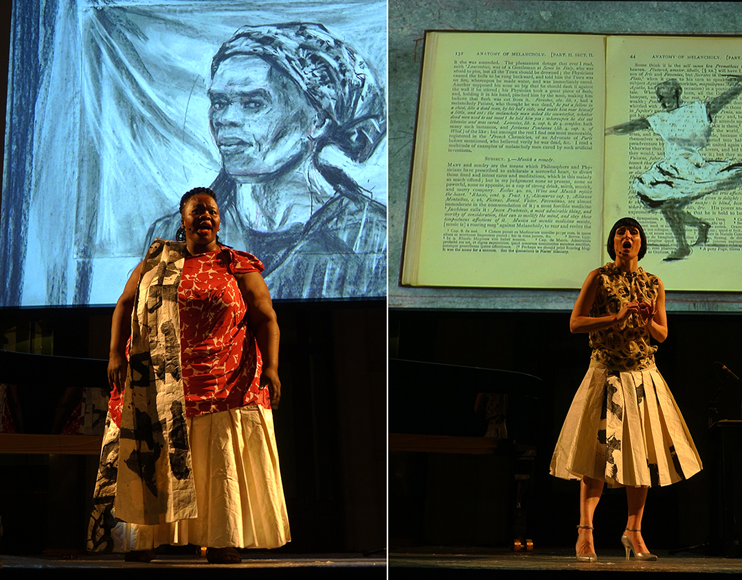Eröffnet wurde die Aufführungsreihe mit den Ciné-Concert „Paper Music“ von William Kentridge im Martin-Gropius-Bau. Es ist das jüngste Ergebnis der langjährigen Zusammenarbeit zwischen William Kentridge und dem südafrikanischen Komponisten Philip Miller. Wunderbar und überzeugend, ja berauschend war der subversiver Lied-Zyklus: die Videoanimationen aus Kohle- oder Tuschezeichnungen untermalt von der Live-Performance der Sängerinnen Ann Masina und Joanna Dudley sowie des Pianisten Vincenzo Pasquariello.