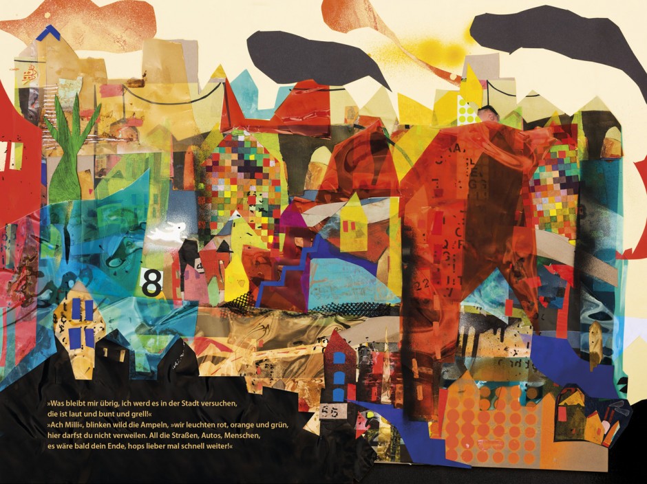 Auf 24 Seiten erzählen Michael Stavaric und Ulrike Möltgen die Geschichte des ängstlichen Hasenmädchens Milli und lassen dabei eine ganz eigene Welt entstehen. In kunstvollen Collagen, mit leuchtenden Farben oder ganz schlicht in Weiß und Schwarz lassen sie die Odyssee des kleinen Häschens lebendig werden, das durch den Wald, die Felder und die laute Stadt zieht.