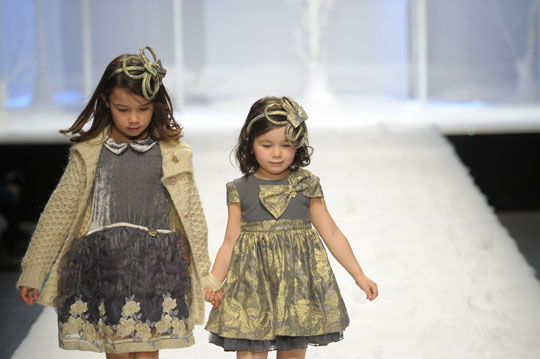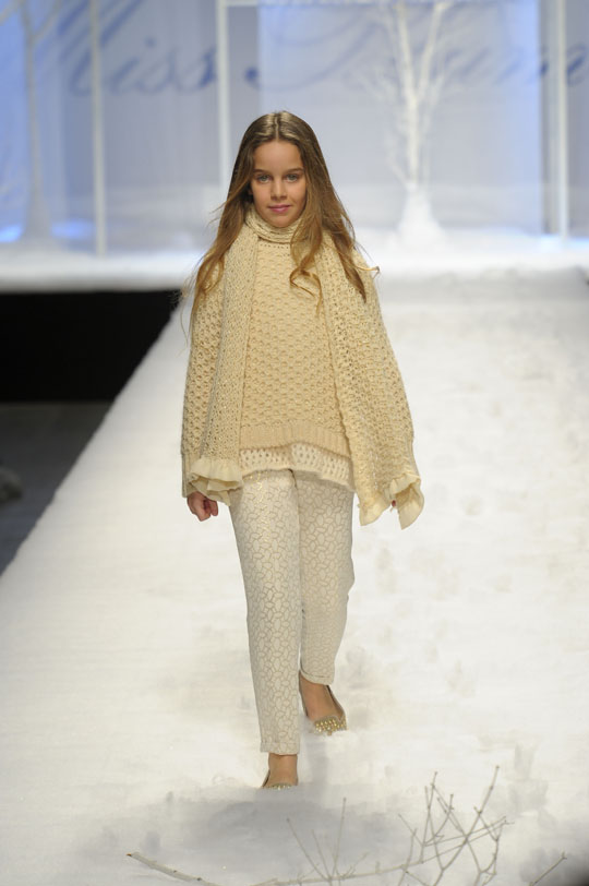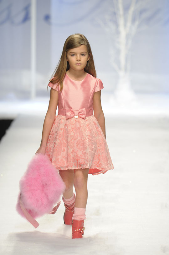 On Thursday, January 17, Anna Molinari’s girls, dressed in powdery shades and bright colors, went through snow-white and frosty woods presenting the collection for next winter season. Like graceful little princesses, the girls were particularly fond of the tones of grey, chamomile and gold and love pleated and laminated skirts. Among the latest temptations offered were honey-yellow eco-friendly fur coats. And this highly creative season featured a surprise finale with a modern Alice in Wonderland plunging into a garden of baby-blue roses embroidered on velvet and silk. A dive into sweetness, which is replicated in the Baby collection rich in stylish details. Guest stars of the show were Rosa and Linda, daughters of actress Claudia Gerini, and Aileen and Olivia, daughters of TV host Silvia Hsieh and Italian football player Alessandro Diamanti.