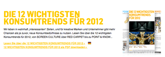 If you want to get more information on trends, trendwatching.com offers scans of the globe for emerging consumer trends, insights and innovations. They report on their findings in free, monthly Trend Briefings. If you want the full 2012 Trend Report on consumer trends, click here www.trendwatching.com