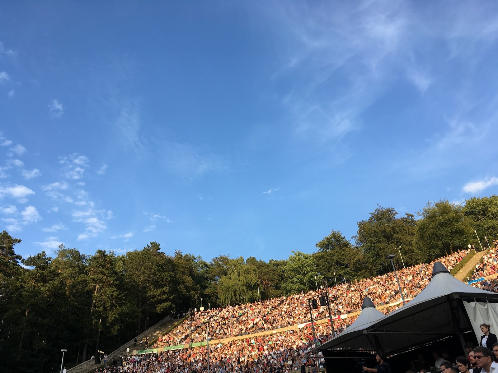 Das West-Eastern Divan Orchestra spielt sich bereits warm, als wir das abfallende Halbrund der Waldbühne betreten und uns Plätze im D-Block suchen. Im Alltagsoutfit sitzen die 110 Musiker aus Ägypten, Syrien, Jordanien, Libanon, Palästina und Israel auf der Bühne. Sie bezaubern mit der Musik bereits bei ihrem Probelauf, obwohl auf den Rängen eher Gewusel und Gespräche vorherrschen. Wir haben ein Mini-Picknick dabei: Käsewürfel, Salami- und Pastrami-Scheiben, schwäbische Seelen, Tomaten, Gürkchen und Kapern. Einfach und gut. Getränke wurden im Vorfeld auf 0,5l pro Person reduziert und auch nur in PET-Flaschen zugelassen. Sicherheit für die 16 000 Besucher geht an diesem Abend vor.